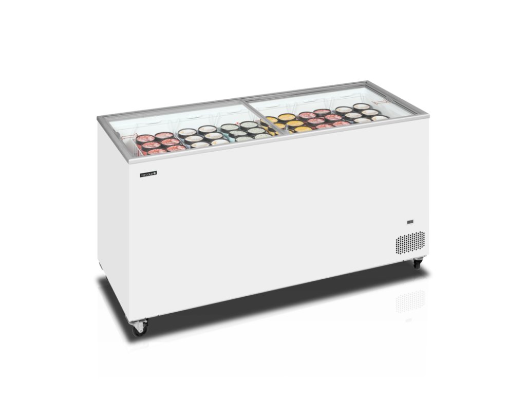 Mraznička je vybavená dvoma rovnými posuvnými vekami z tvrdeného skla so zámkom, čo zaručuje bezpečné skladovanie aj v samoobslužných prevádzkach. Priehľadné veko zároveň zvyšuje vizuálnu atraktivitu vystaveného tovaru.